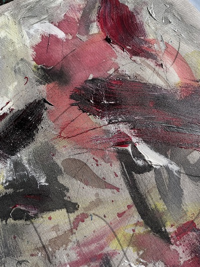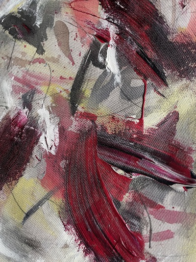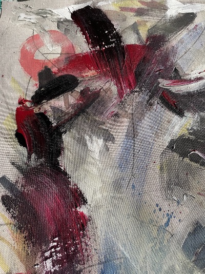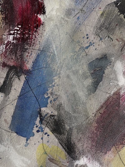 Una combinazione di diverse tecniche pittoriche, dall’acquerello alle pennellate ad olio per creare una stratificazione di pensieri e riflessioni su forme e colori.